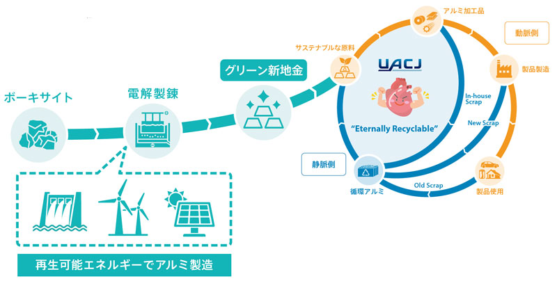 在庫品アルミニウムは原料から新地金を製錬する工程で大量の電力を消費しますが、再生可能電力由来の新地金に置き換えることで環境負荷を大幅に低減します。